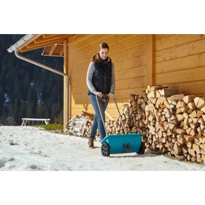 Der Gardena Streuwagen L eignet sich optimal zum komfortablen Ausbringen von Dünger und Streusalz auf mittelgroßen Flächen. Er lässt sich einfach über die Auf-/Zu-Funktion per Handgriff bedienen, an dem auch die Streumenge eingestellt wird. Der Abdeckschieber schließt den Streubehälter so dicht ab, dass im Stand, beim Befüllen oder nach Gebrauch nichts nachrieselt. Die spezielle Streuwalze verteilt das Streugut absolut gleichmäßig, sauber und nur an den Stellen, wo es auch hin soll.